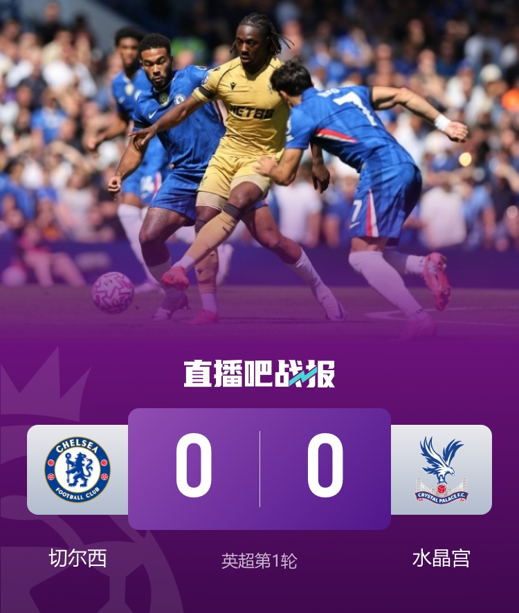 英超第1轮,切尔西0-0战平水晶宫,埃泽进球被判无效。