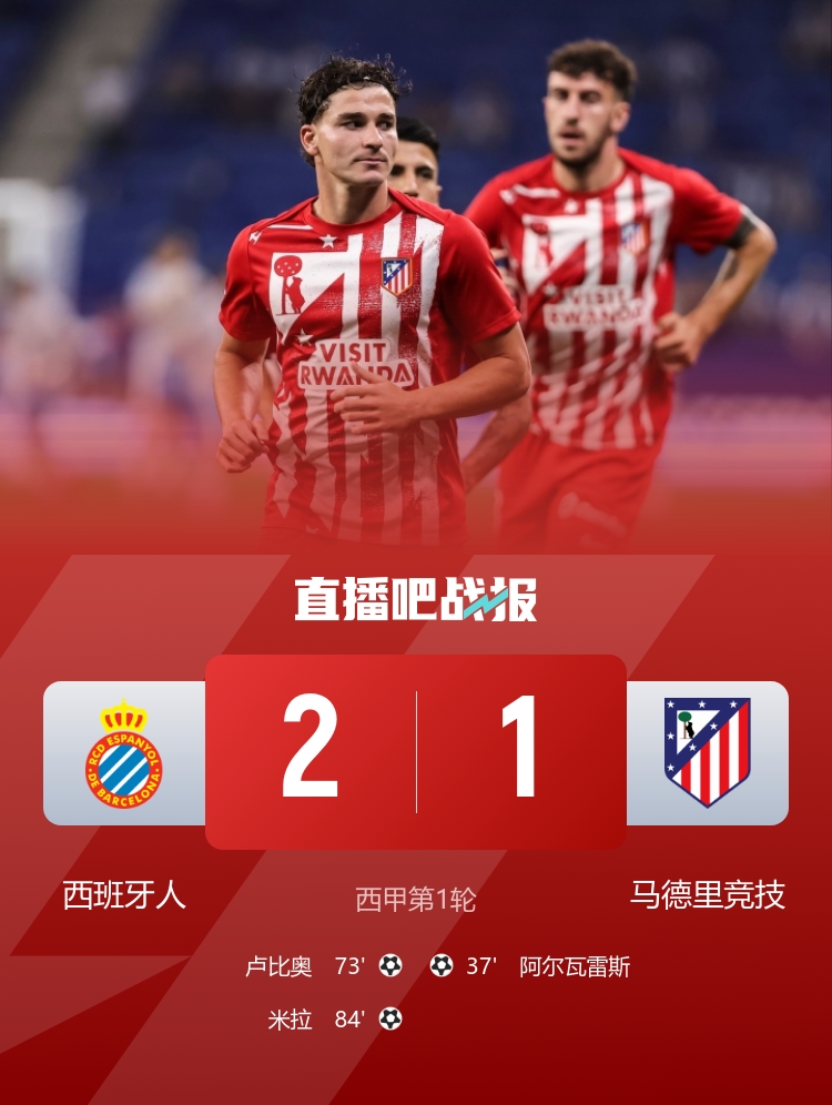 西甲第1轮,马竞1-2遭西班牙人逆转,阿尔瓦雷斯任意球世界波。