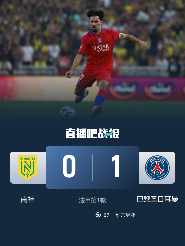 法甲第1轮,巴黎圣日耳曼1-0战胜南特,维蒂尼亚远射制胜。